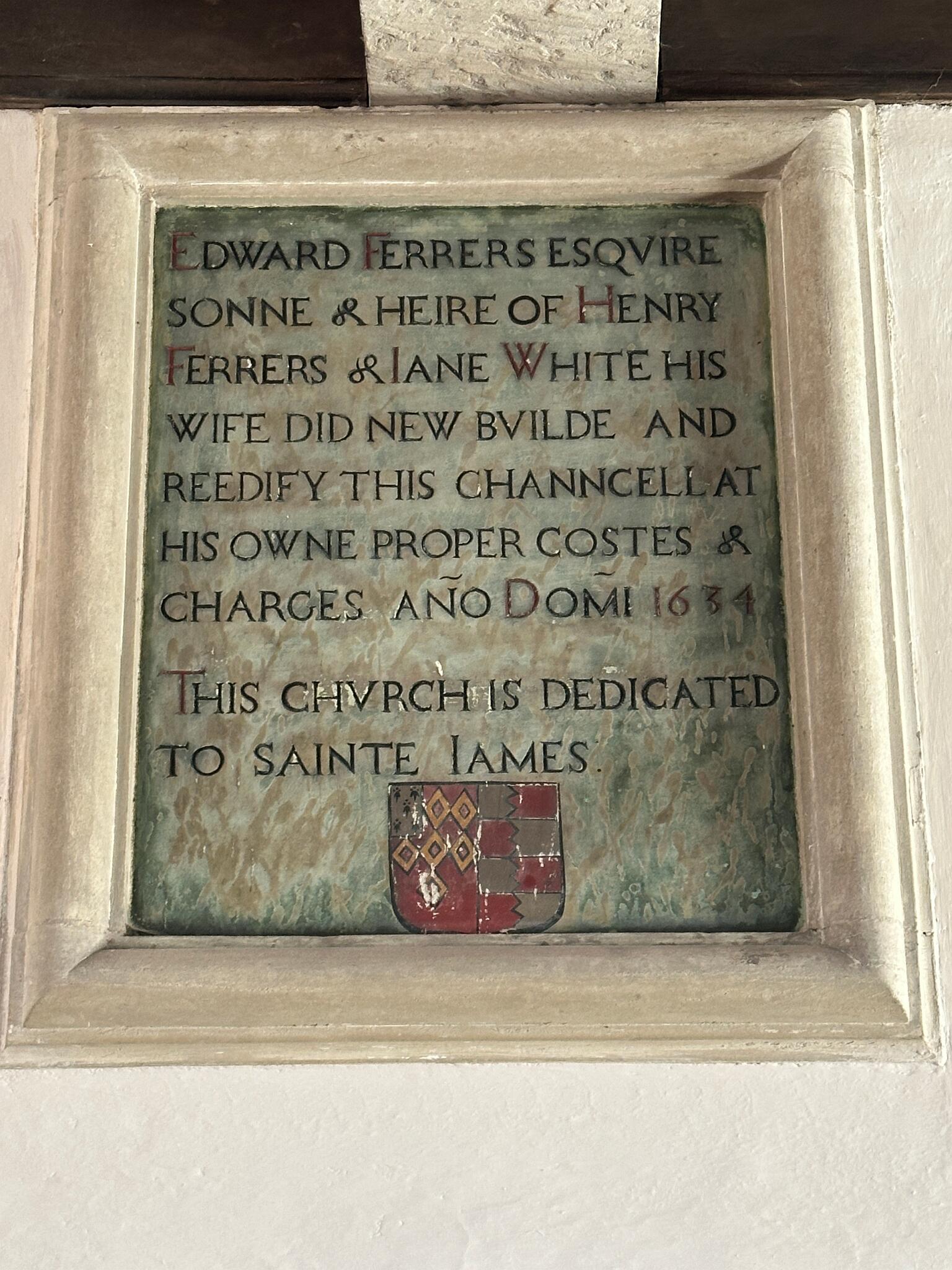 8 Plaque in the chancel recording the dedication of the church to St James in 1634. When and why it was changed to St Michael is a mystery