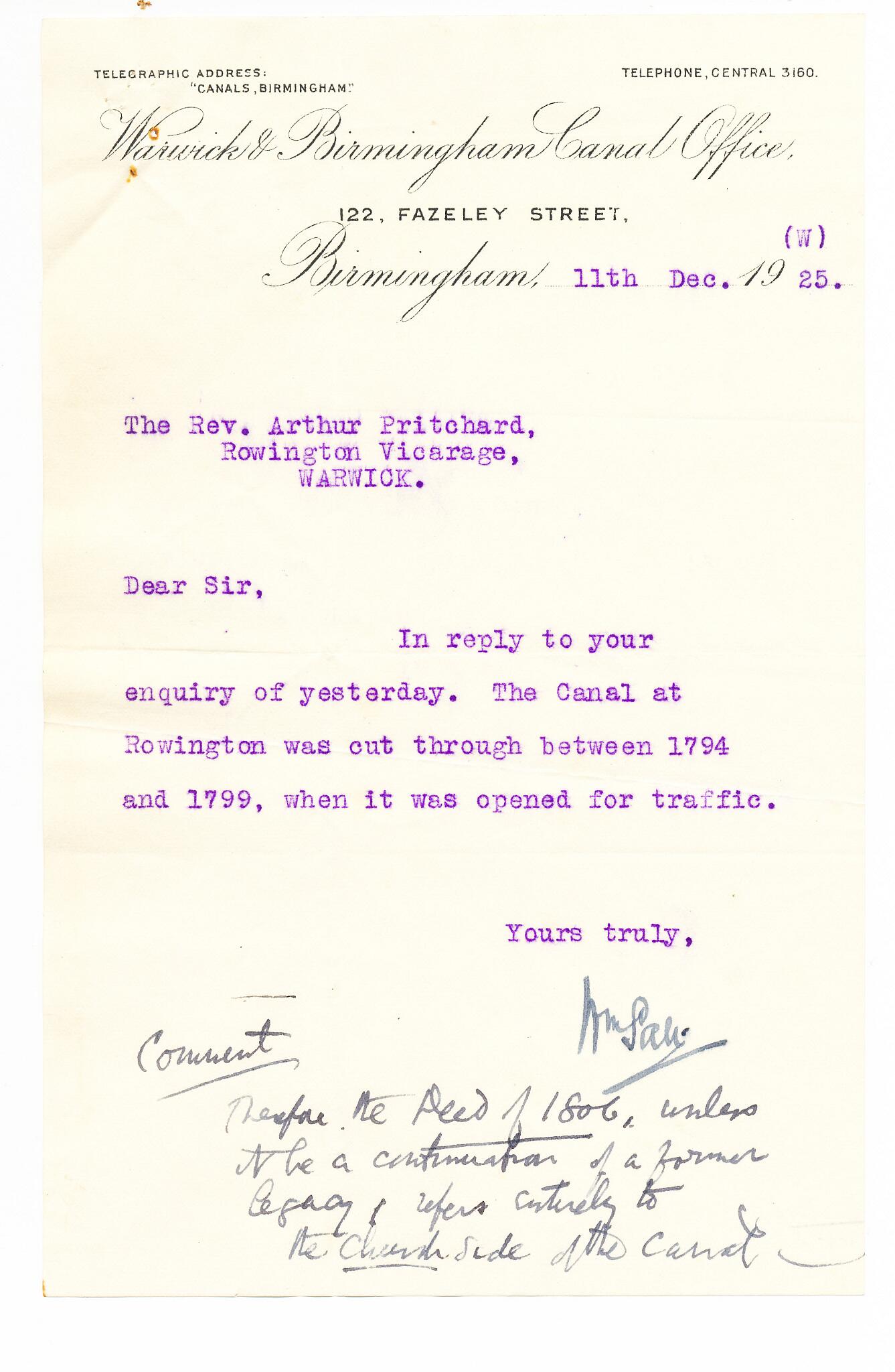 12 Letter from the canal company in 1925 to Rev Arthur Pritchard in Rowington. Pritchard was concerned about the Chancel Repair Liability when land around the canal was sold.