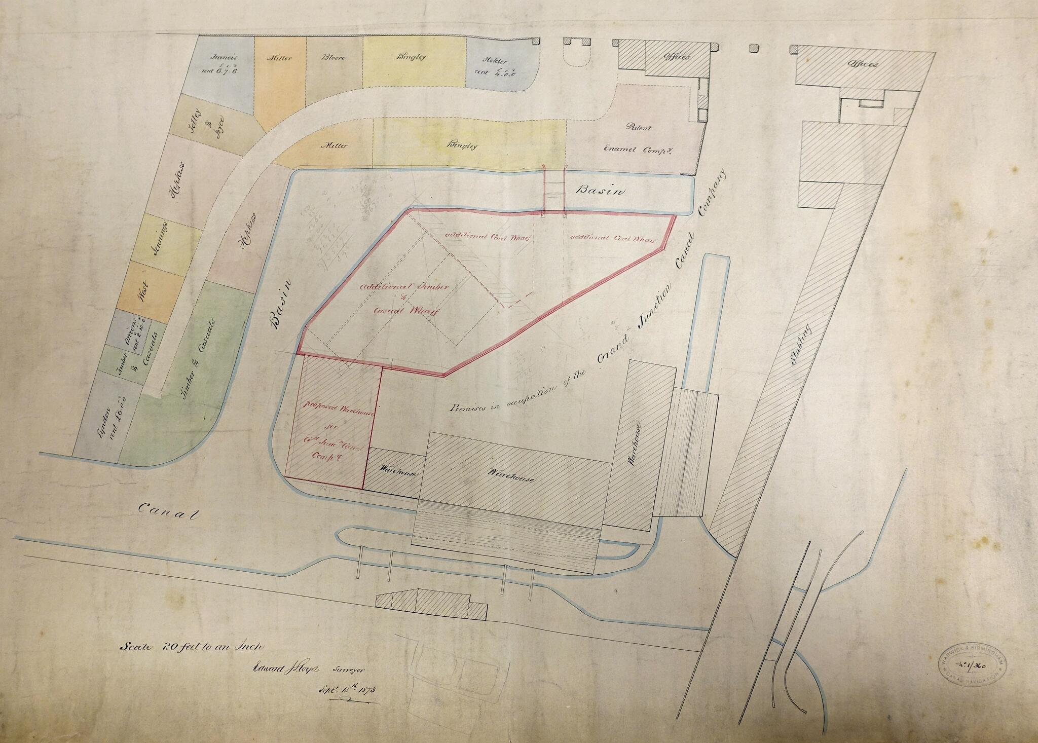 5 Warwick Wharf: 1.Lock house, 2. Warehouse 1810, 3.Warehouse 1812, 4.BCN Warehouse, 5.Grand Junction Carrying Co. warehouse, 6. Stables, 7. Warwick & Birmingham Co. Offices, 8. Coal and timmber wharf