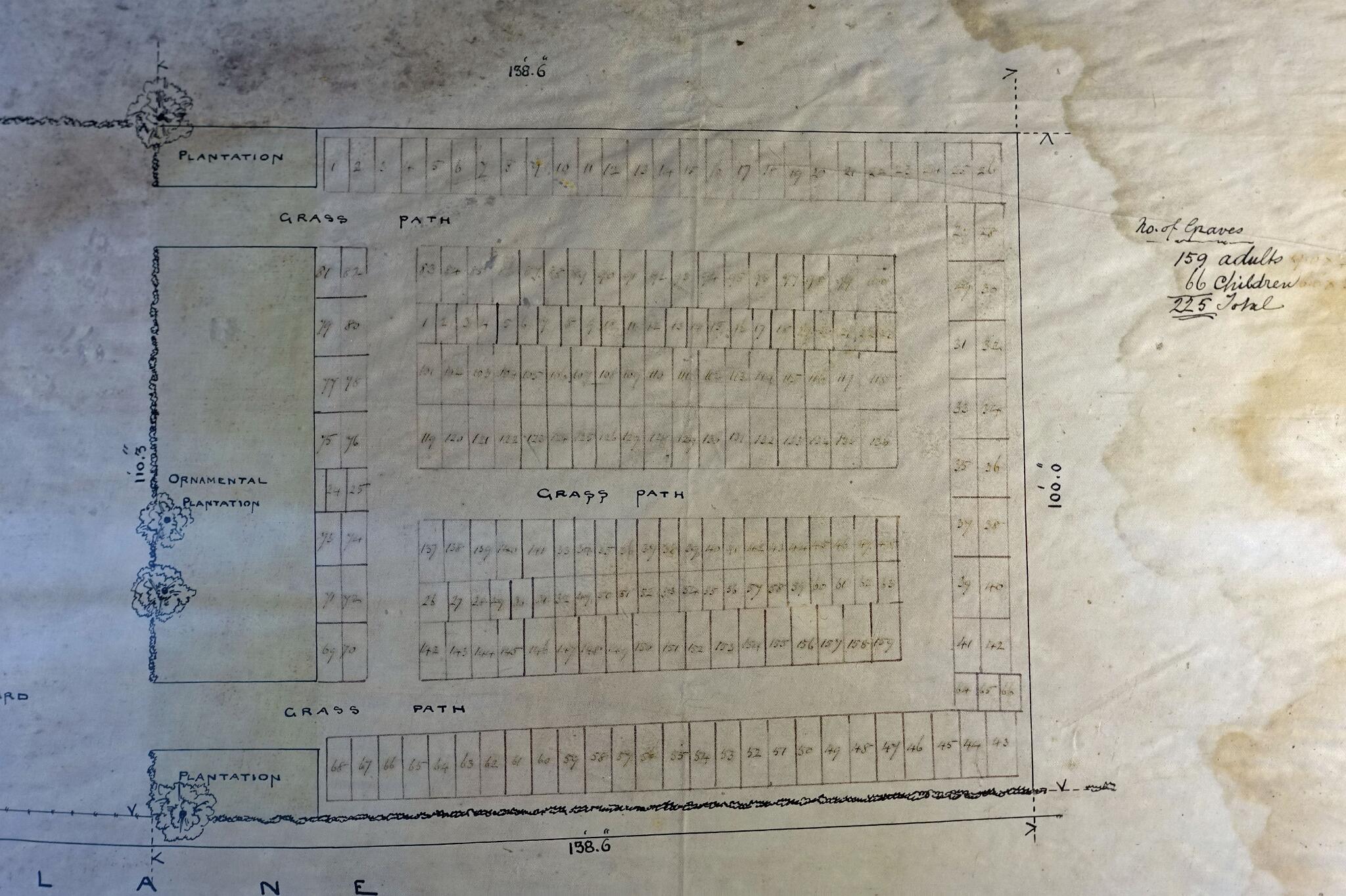 6 Redrawn version of plan of new graveyard annotated with known graves and existing memorials