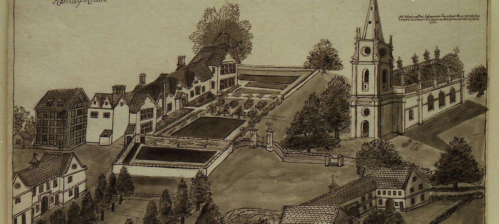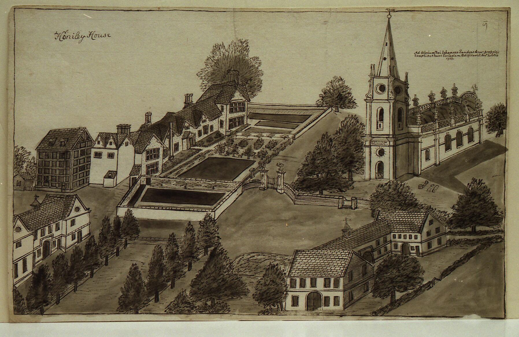 2 c18th drawing of Honiley Old Hall and Church. The old hall was demolished c1820 and a replacement built 300 yards away by HL Wade in 1914. The two c17th service wings of the old house survive. St John the Baptist church was built on the site of an older church in 1723