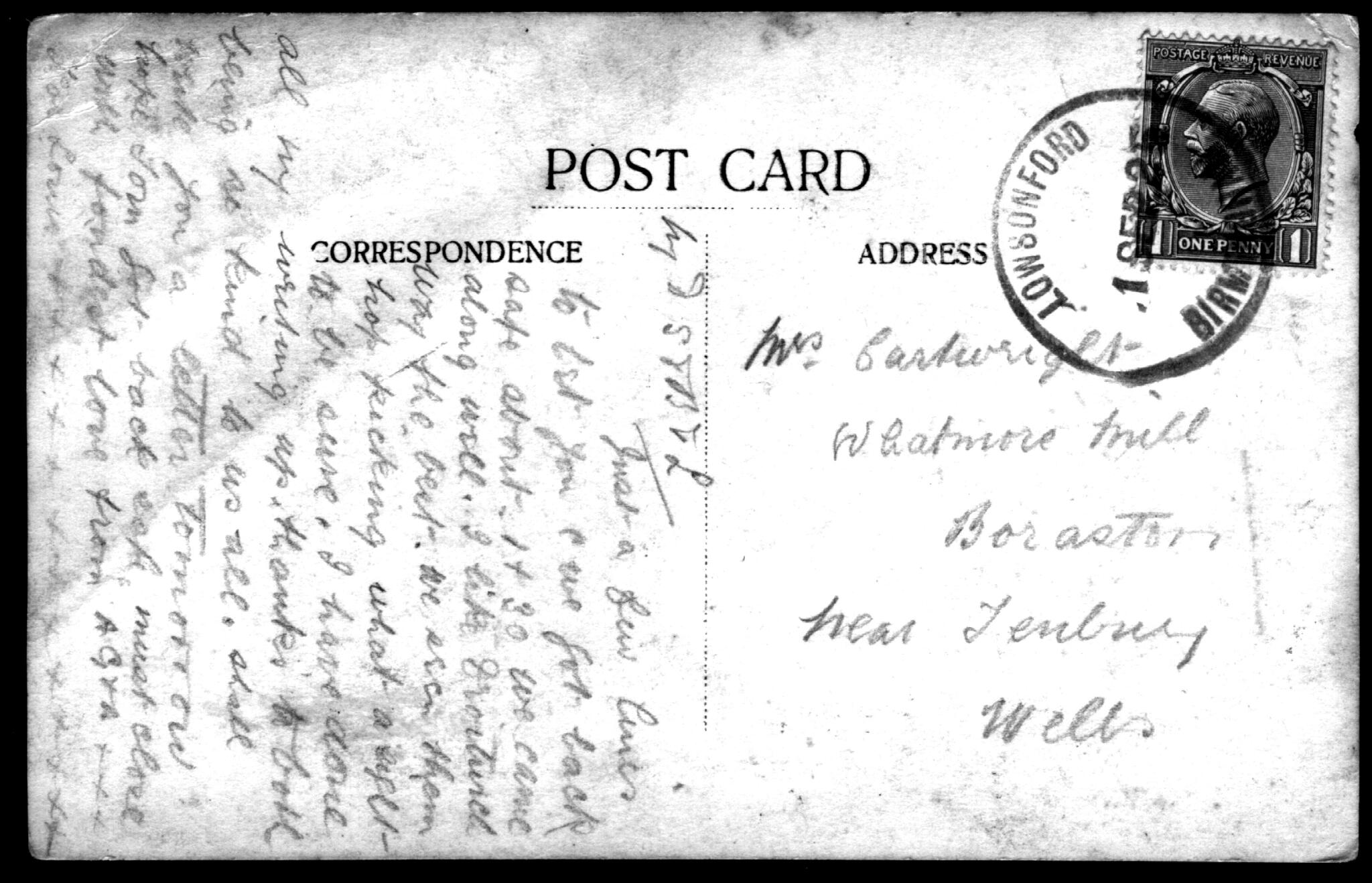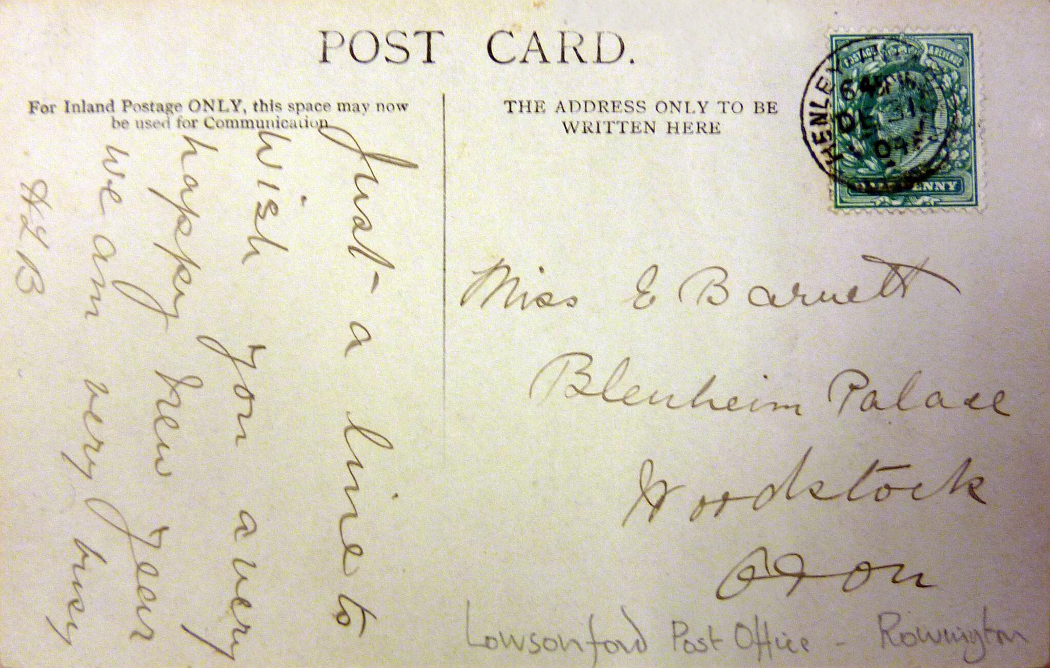 20 Reverse of old postcard from Lowsonford Post Office. Addressed to Miss E Barnett who appears to be in service at Blenheim Palace