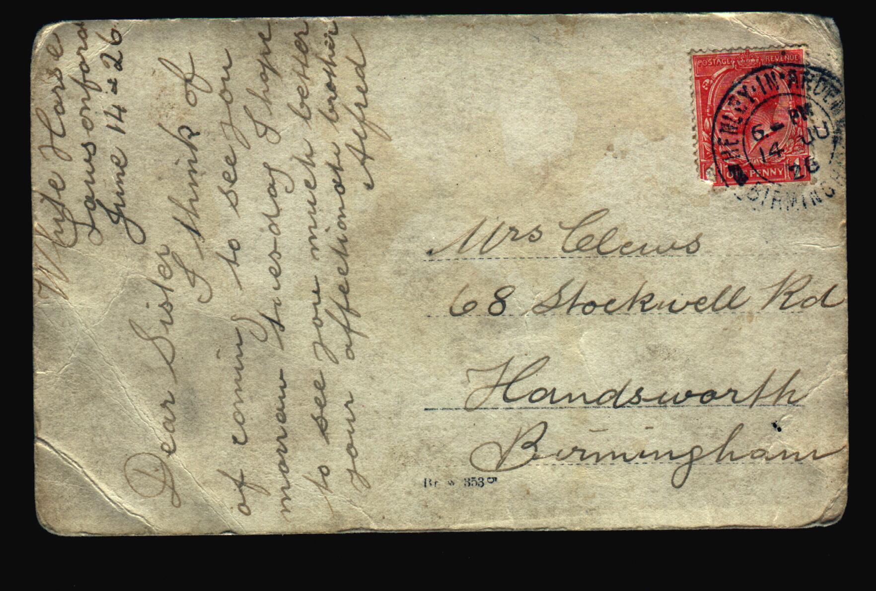 19 Front of postcard to Miss E Barnett at Blenheim Palace