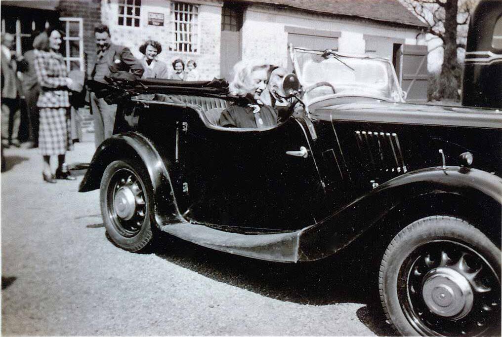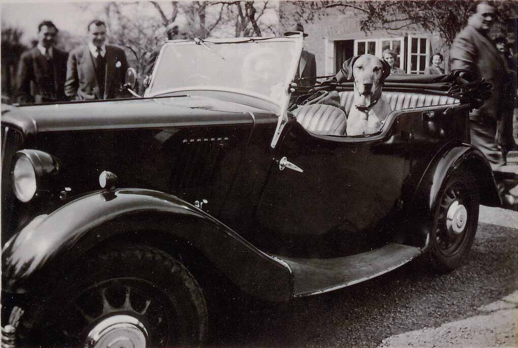 9 Morris Eight with dog, outside The Boot