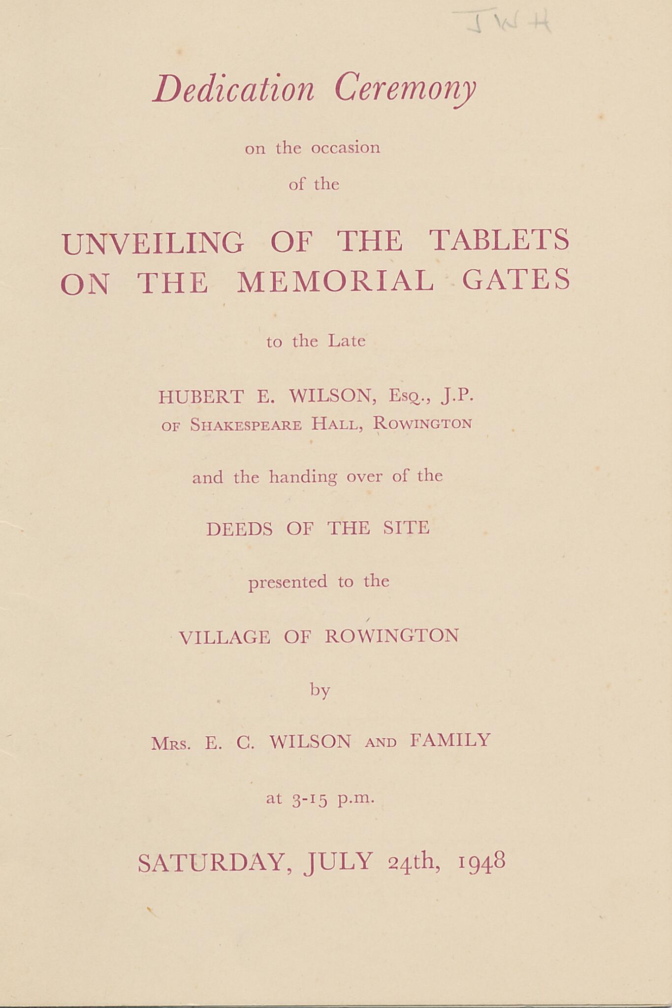5 Programme for dedication ceremony for Rowington Village Hall gates and the deeds to the site for the Hall in 1948. Full document as PDF file here