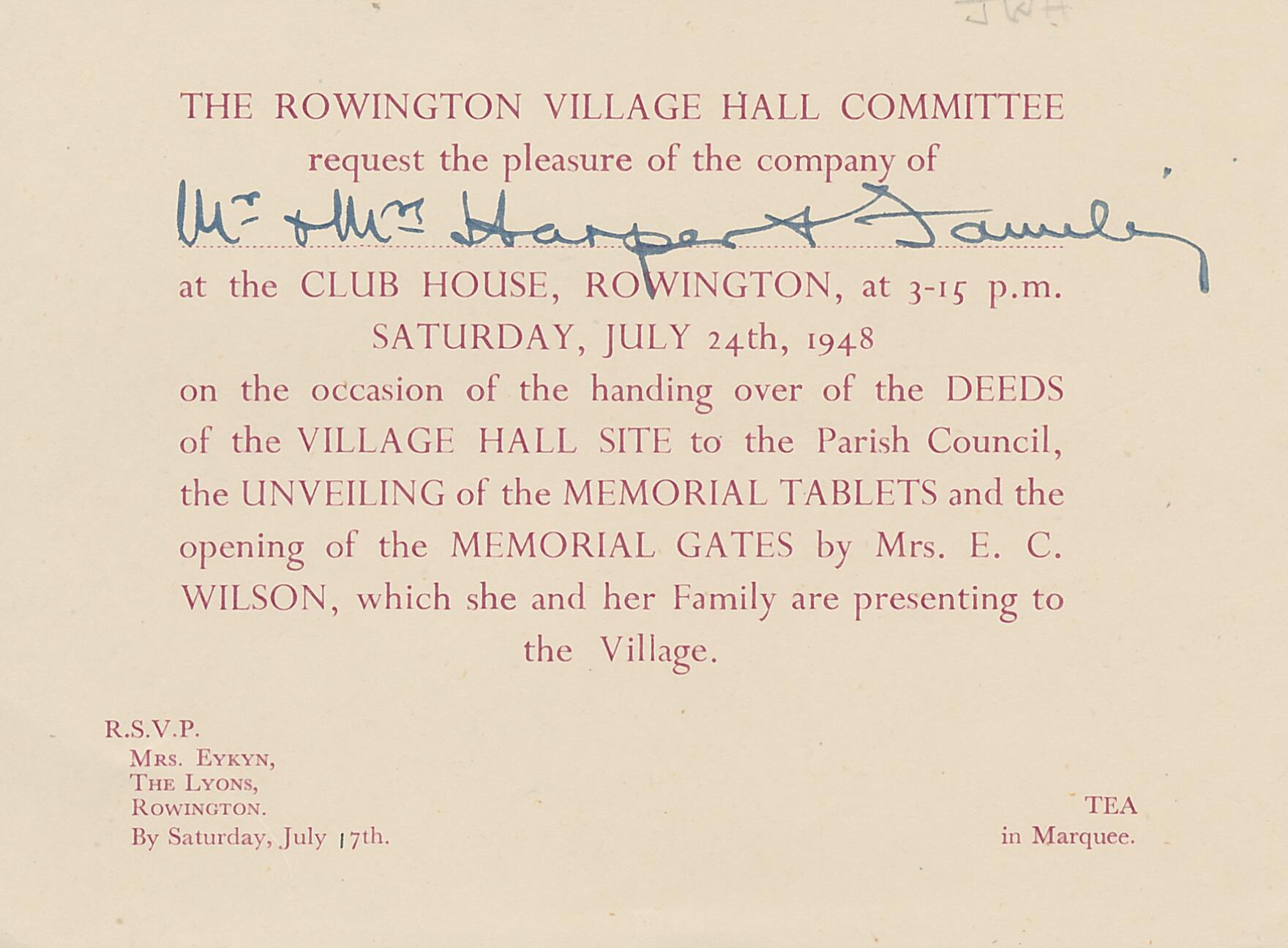 6 Invitation to Mr JW Harper to the dedication ceremony for Rowington Village Hall gates and the deeds to the site for the Hall in 1948