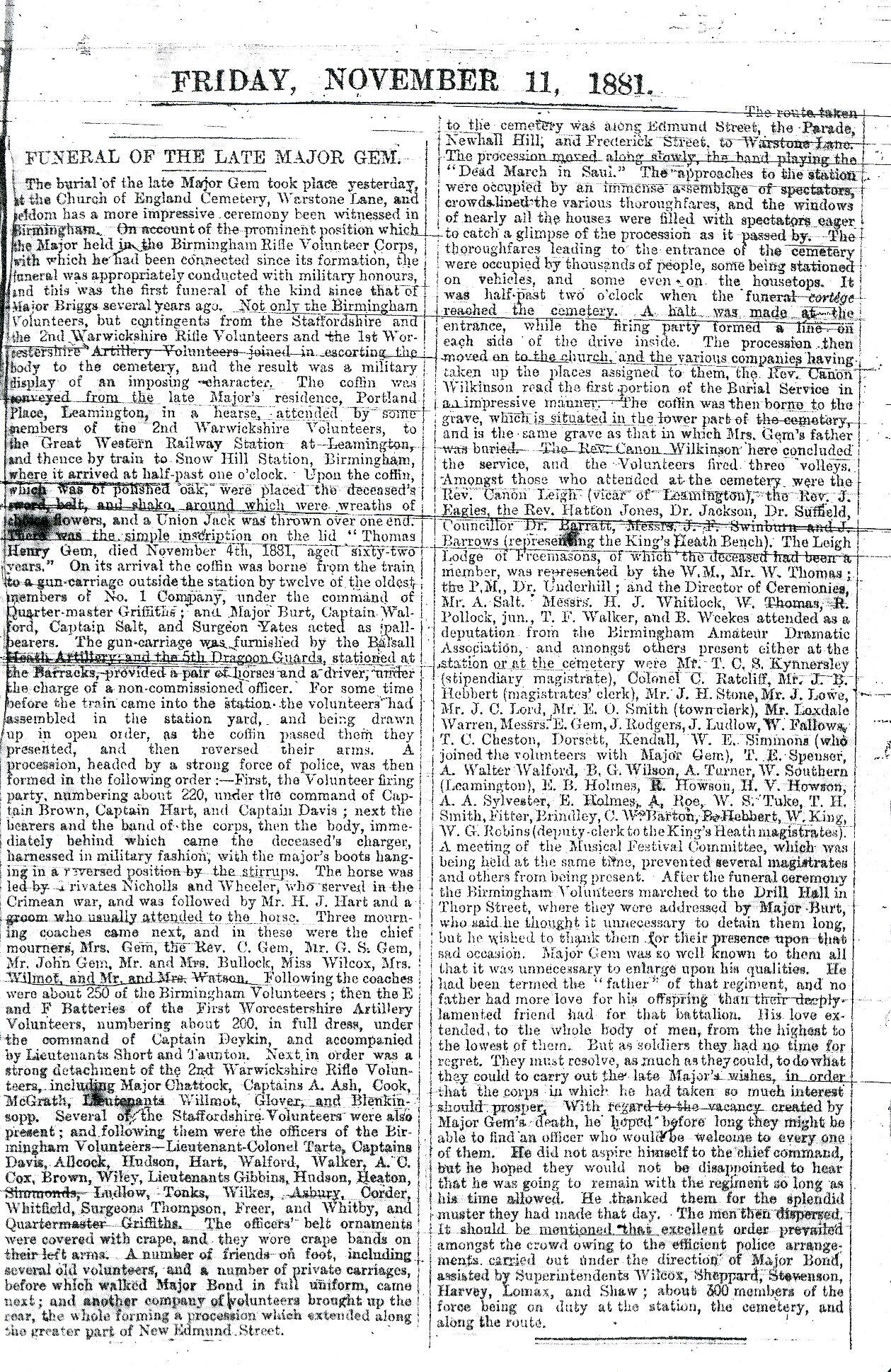 5 Newspaper reports of the death of Major Henry Gem in 1881