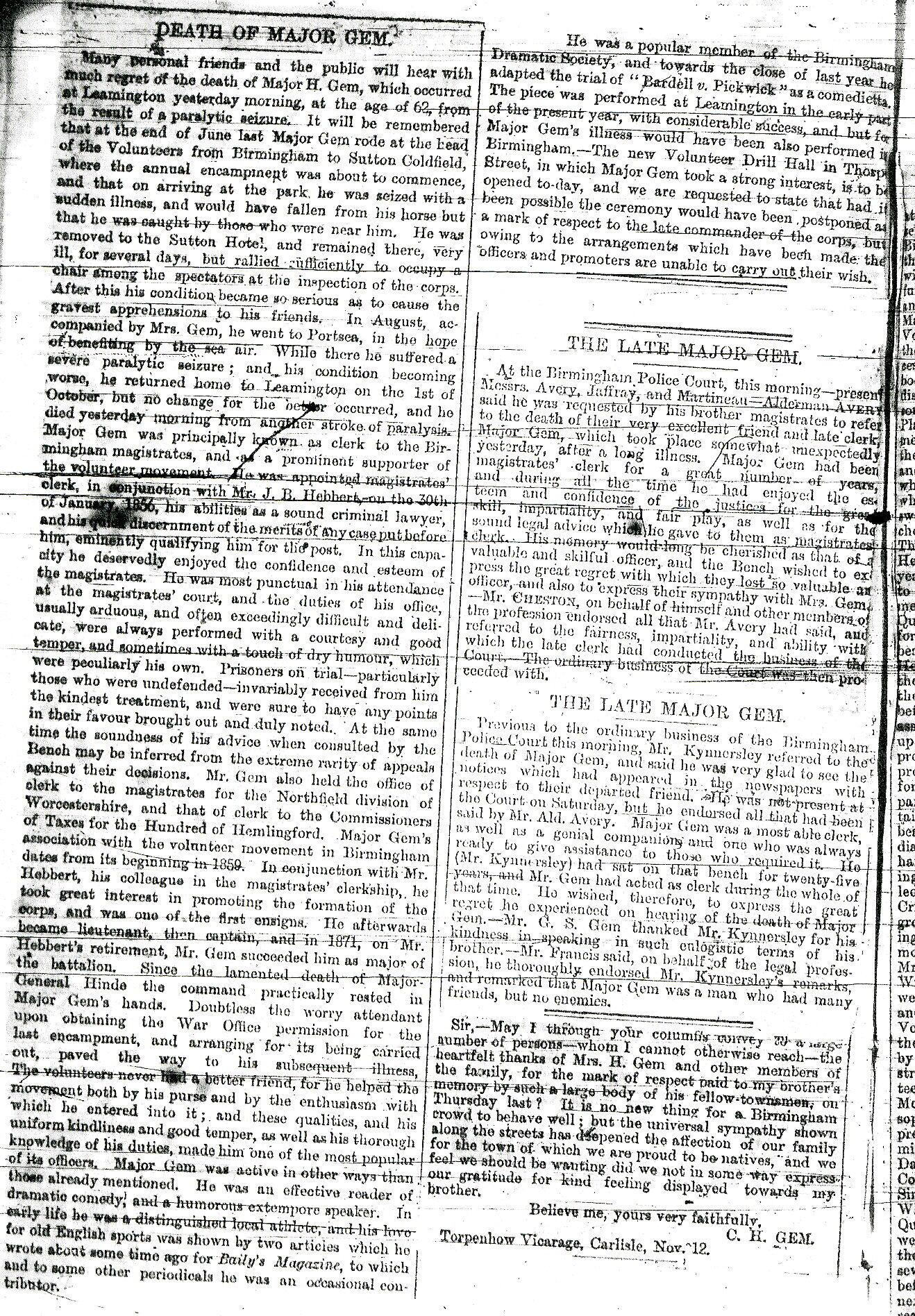 6 Newspaper reports of the death of Major Henry Gem in 1881