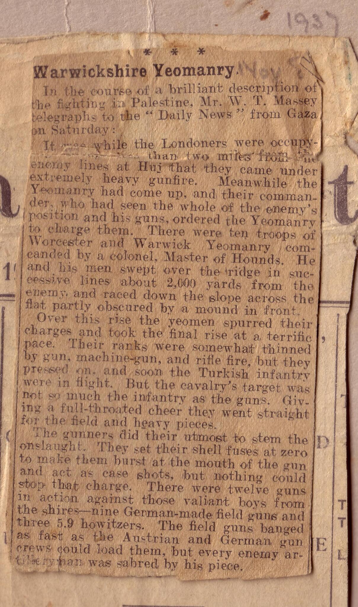 7 Newspaper article describing the Cavalry charge by the Warwickshire Yeomen at Huj in Palestine, November 1917. Anthony Gardner Hanson and his brother Wilfred from Rowington took part on horseback