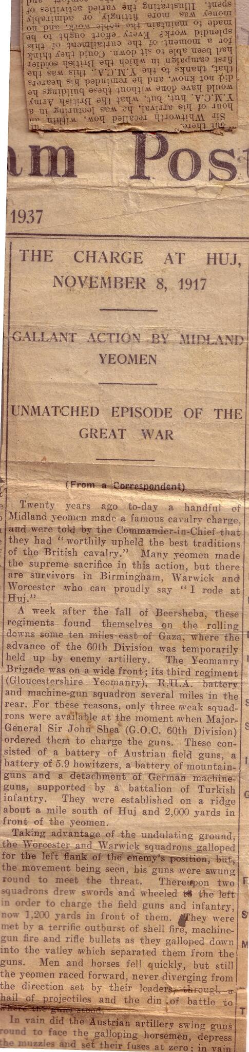8 Newspaper article describing the Cavalry charge by the Warwickshire Yeomen at Huj in Palestine, November 1917. Anthony Gardner Hanson and his brother Wilfred from Rowington took part on horseback