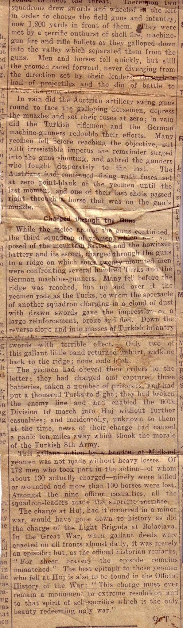 9 Newspaper article describing the Cavalry charge by the Warwickshire Yeomen at Huj in Palestine, November 1917. Anthony Gardner Hanson and his brother Wilfred from Rowington took part on horseback