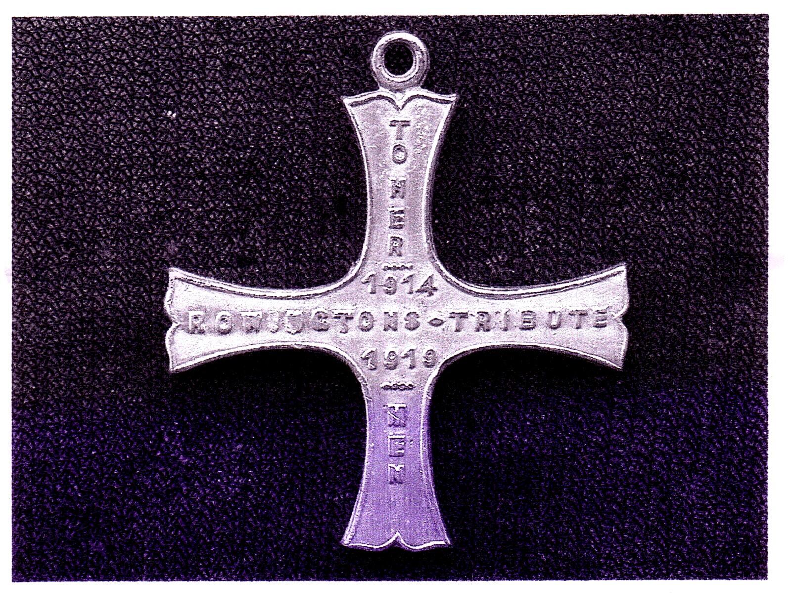 6 Small silver cross 1.25" x 1.25" "Rowington Tribute to Her Men 1914-1919", owned by Dot Sly and presented to her uncle Bill Bolton. Another was found by a metal detectorist, Chris Laundy in 2004 in Mousley End. The further crosses are held by the Smith family presented to Alban, Joseph and Osborn Smith.