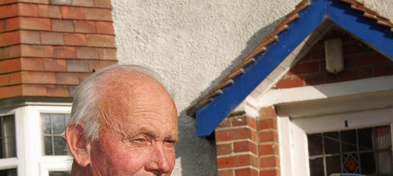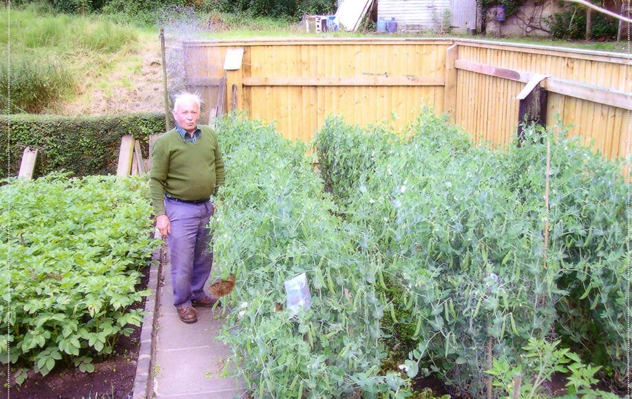 5 Bob Sweetman in back garden at No 1 Finwood Road with pea rows and potatoes